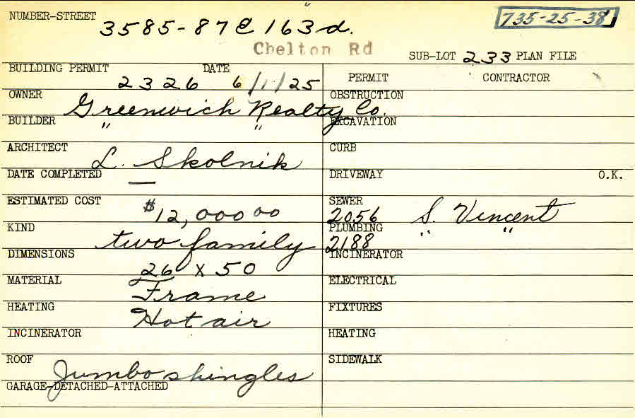 3585 Chelton Road Shaker Heights, OH 44120 PARCEL ID: 735-25-038 Building Permit Date: 06-01-1925 Neighborhood: Moreland Owner: Greenwich Realty Company Builder: Greenwich Realty Company Architect: Skolnik, Louis Estimated Cost: 12000 Kind: Duplex or Two-Family Material: Frame Heating: Hot Air Roof: Shingles Blueprints: no blueprints on microfilm |