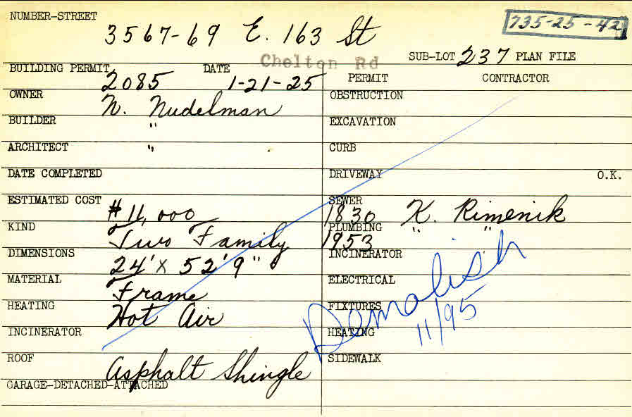 3567 Chelton Road Shaker Heights, OH 44120 PARCEL ID: 735-25-042 Building Permit Date: 01-21-1925 Plan File Number: 0 Neighborhood: Moreland Owner: Nudelman, N. Builder: Nudelman, N. Architect: Nudelman, N. Estimated Cost: 11000 Kind: Duplex or Two-Family Material: Frame Heating: Hot Air Roof: Asphalt Shingles Card Available: yes |