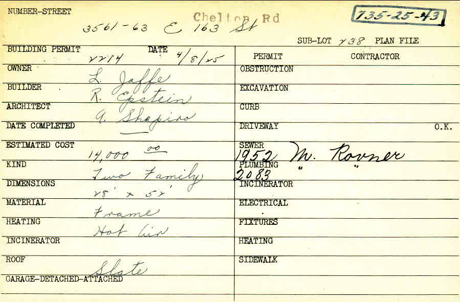 3561 Chelton Road Shaker Heights, OH 44120 PARCEL ID: 735-25-043 Building Permit Date: 04-08-1925 Plan File Number: 0 Neighborhood: Moreland Owner: Jaffe, L. Builder: Epstein, R. Architect: Shapiro, A. Estimated Cost: 14000 Kind: Duplex or Two-Family Material: Frame Heating: Hot Air Roof: Slate Card Available: yes |