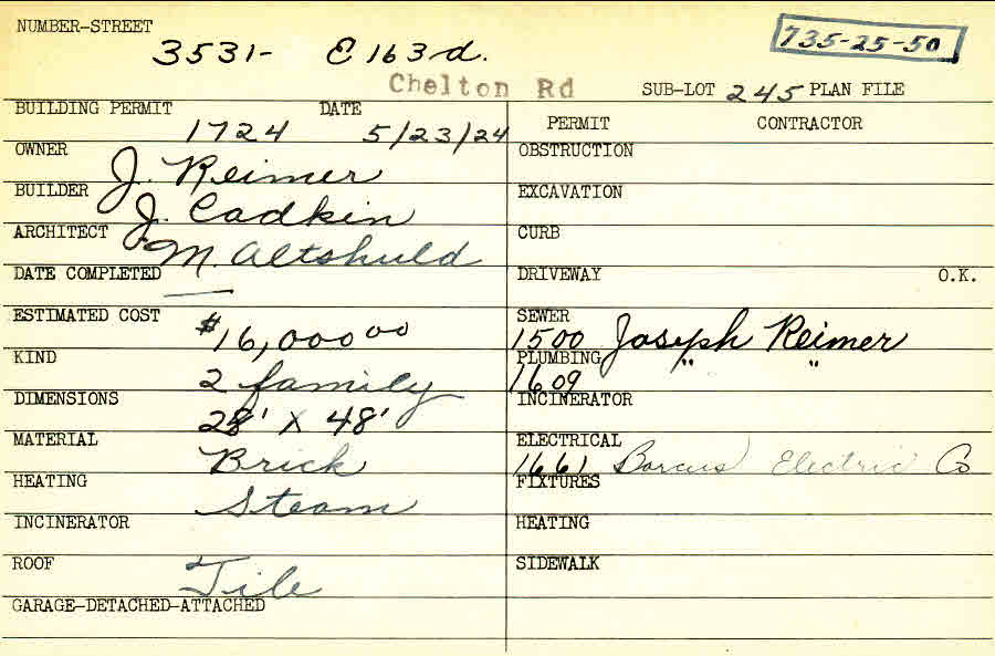 3531 Chelton Road Shaker Heights, OH 44120 PARCEL ID: 735-25-050 Building Permit Date: 05-23-1924 Plan File Number: 0 Neighborhood: Moreland Owner: Reimer, J. Builder: Cadkin, J. Architect: Altshuld, M. Estimated Cost: 16000 Kind: Duplex or Two-Family Material: Brick Heating: Steam Roof: Tile Card Available: yes |