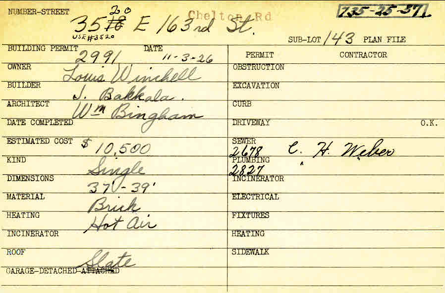 3520 Chelton Road Shaker Heights, OH 44120 PARCEL ID: 735-25-057 Building Permit Date: 11-03-1926 Plan File Number: 0 Neighborhood: Moreland Owner: Winchell, Louis Builder: Bakkala, J. Architect: Bingham, William A. Estimated Cost: 10500 Kind: Single, Single Residence or Dwelling Material: Brick Heating: Hot Air Roof: Slate Garage: detached |
