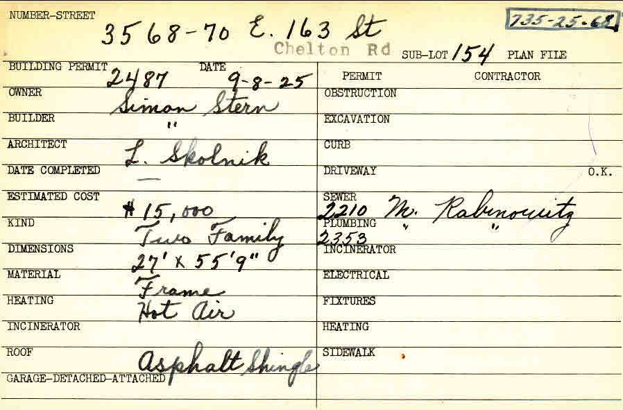 3568 Chelton Road Shaker Heights, OH 44120 PARCEL ID: 735-25-068 Building Permit Date: 09-08-1925 Neighborhood: Moreland Owner: Stern, Simon Builder: Stern, Simon Architect: Skolnik, Louis Estimated Cost: 15000 Kind: Duplex or Two-Family Material: Frame Heating: Hot Air Roof: Asphalt Shingles Blueprints: no blueprints on microfilm |