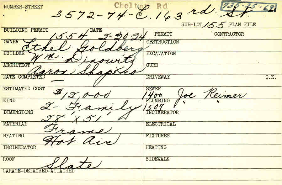3572 Chelton Road Shaker Heights, OH 44120 PARCEL ID: 735-25-069 Building Permit Date: 02-20-1924 Plan File Number: 0 Neighborhood: Moreland Owner: Goldberg, Ethel Builder: Dinowitz, William Architect: Shapiro, Aaron Estimated Cost: 12000 Kind: Duplex or Two-Family Material: Frame Heating: Hot Air Roof: Slate Card Available: yes |