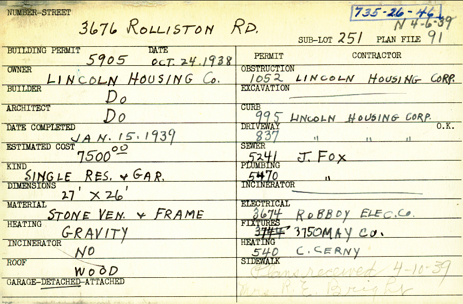 3676 Rolliston Road Shaker Heights, OH 44120 PARCEL ID: 735-26-046 Building Permit Date: 10-24-1938 Plan File Number: 4243 scanned, 5358 Microfilm Roll: Roll062, Roll#73 Neighborhood: Lomond Owner: Lincoln Housing Company Builder: Lincoln Housing Company Architect: Lincoln Housing Company Estimated Cost: 7500 Date Completed: 01-15-1939 Kind: Single Dwelling and Garage Material: Stone Veneer and Frame Heating: Gravity System Roof: Wood Garage: detached |