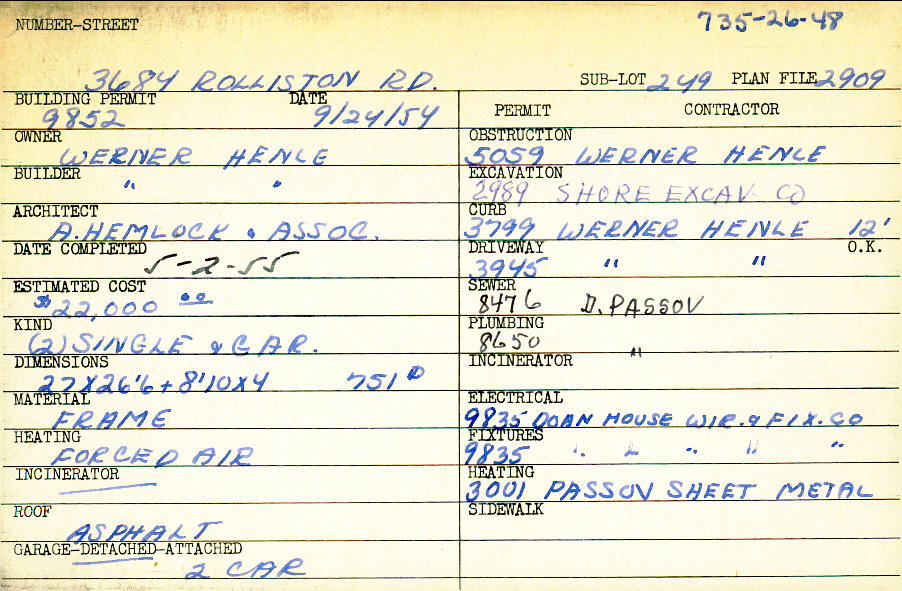 3684 Rolliston Road Shaker Heights, OH 44120 PARCEL ID: 735-26-048 Building Permit Date: 09-24-1954 Plan File Number: 2909 all scanned Microfilm Roll: Roll041 Neighborhood: Lomond Owner: Henle, Werner Builder: Henle, Werner Architect: A. Hemlock and Associates Estimated Cost: 22000 Date Completed: 05-02-1955 Kind: Single Dwelling and Garage (2) Material: Frame Heating: Forced Air Roof: Asphalt Garage: detached 2 car |