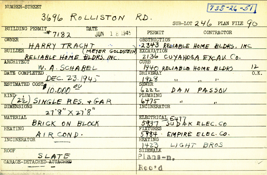 3696 Rolliston Road Shaker Heights, OH 44120 PARCEL ID: 735-26-051 Building Permit Date: 06-18-1945 Plan File Number: 90 all scanned Microfilm Roll: Roll001 Neighborhood: Lomond Owner: Tracht, Harry Builder: Reliable Home Builders Inc.(Meyer Goldstein) Architect: Schabel, W. A. Estimated Cost: 10000 Date Completed: 12-23-1945 Kind: Single 2-1/2 Material: Brick on Block Heating: Air Conditioned Roof: Slate Garage: detached |