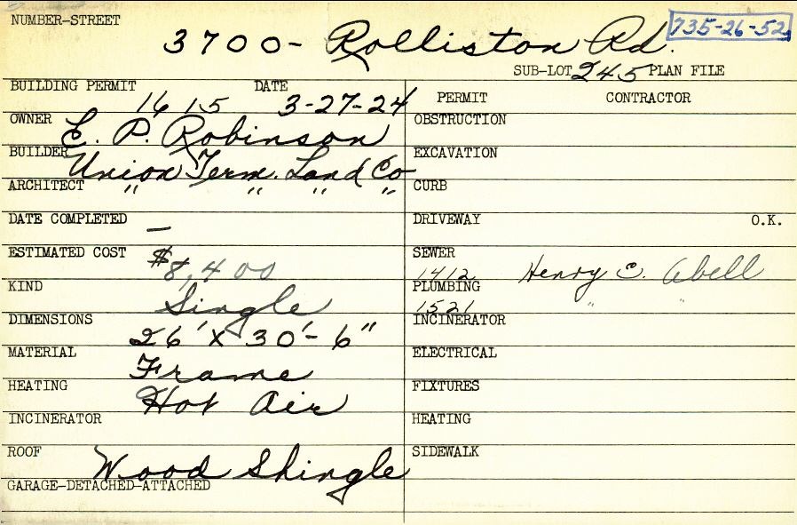3700 Rolliston Road Shaker Heights, OH 44120 PARCEL ID: 735-26-052 Building Permit Date: 03-27-1924 Plan File Number: 0 Neighborhood: Lomond Owner: Robinson, E. P. Builder: Union Terminal Land Company Architect: Union Terminal Land Company Estimated Cost: 8400 Kind: Single, Single Residence or Dwelling Material: Frame Heating: Hot Air Roof: Wood Shingle |