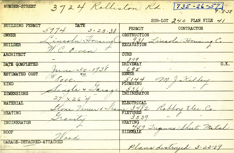 3724 Rolliston Road Shaker Heights, OH 44120 PARCEL ID: 735-26-057 Building Permit Date: 03-23-1938 Plan File Number: 41 Neighborhood: Lomond Owner: Lincoln Housing Company Builder: Owen, W. C. Estimated Cost: 8000 Date Completed: 06-30-1938 Kind: Single Dwelling and Garage Material: Stone Veneer and Frame Heating: Gravity System Roof: Wood Garage: detached |