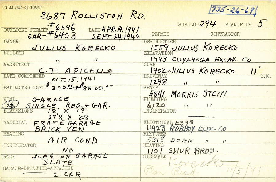 3687 Rolliston Road Shaker Heights, OH 44120 PARCEL ID: 735-26-069 Building Permit Date: 09-24-1940 Plan File Number: 5 Neighborhood: Lomond Owner: Korecko, Julius Builder: Korecko, Julius Architect: Apicella, C. T. Estimated Cost: 8800 Date Completed: 10-15-1941 Kind: Single 2-1/2 Material: Brick Veneer Heating: Air Conditioned Roof: Slate Garage: detached 2 car |