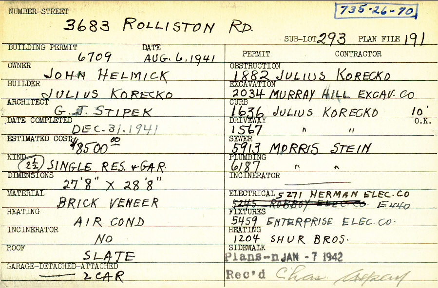 3683 Rolliston Road Shaker Heights, OH 44120 PARCEL ID: 735-26-070 Building Permit Date: 08-06-1941 Plan File Number: 191 Neighborhood: Lomond Owner: Helmick, John Builder: Korecko, Julius Architect: Stipek, G. J. Estimated Cost: 8500 Date Completed: 12-31-1941 Kind: Single 2-1/2 Material: Brick Veneer Heating: Air Conditioned Roof: Slate Garage: detached 2 car |