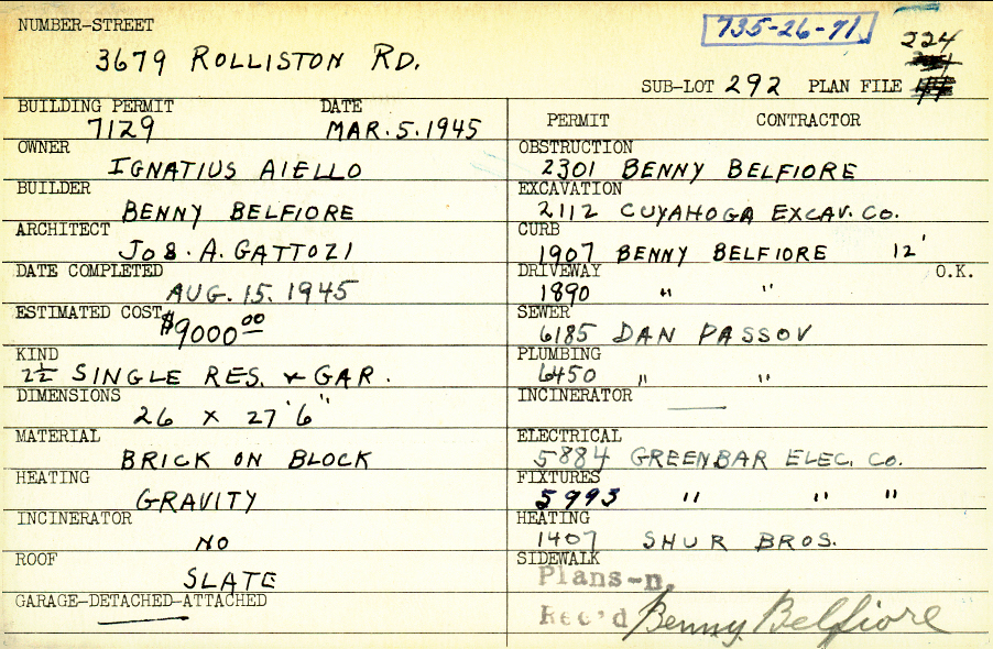 3679 Rolliston Road Shaker Heights, OH 44120 PARCEL ID: 735-26-071 Building Permit Date: 03-05-1945 Plan File Number: 224 Neighborhood: Lomond Owner: Aiello, Ignatius Builder: Belfiore, Benny Architect: Gattozi, Joseph A. Estimated Cost: 9000 Date Completed: 08-15-1945 Kind: Single 2-1/2 Material: Brick on Block Heating: Gravity System Roof: Slate Garage: detached |