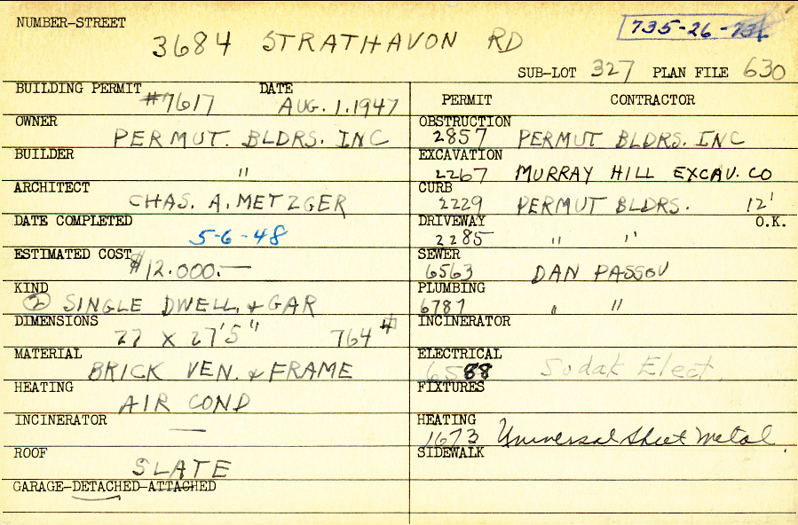 3684 Strathavon Road Shaker Heights, OH 44120 PARCEL ID: 735-26-073 Building Permit Date: 08-01-1947 Plan File Number: 630 all scanned Microfilm Roll: Roll008 Neighborhood: Lomond Owner: Permut Builders Inc. Builder: Permut Builders Inc. Architect: Metzger, Charles A. Estimated Cost: 12000 Date Completed: 05-06-1948 Kind: Single Dwelling and Garage (2) Material: Brick Veneer and Frame Heating: Air Conditioned Roof: Slate Garage: detached |