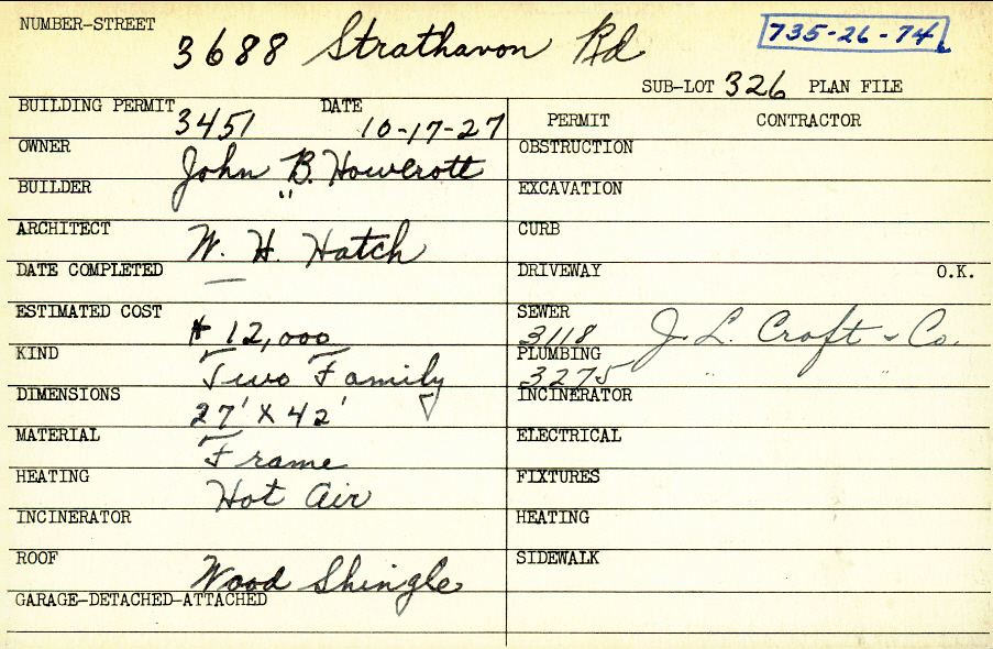 3688 Strathavon Road Shaker Heights, OH 44120 PARCEL ID: 735-26-074 Building Permit Date: 10-17-1927 Plan File Number: 0 Neighborhood: Lomond Owner: Howlrott, John B. Builder: Howlrott, John B. Architect: Hatch, W. H. Estimated Cost: 12000 Kind: Duplex or Two-Family Material: Frame Heating: Hot Air Roof: Wood Shingle Card Available: yes |