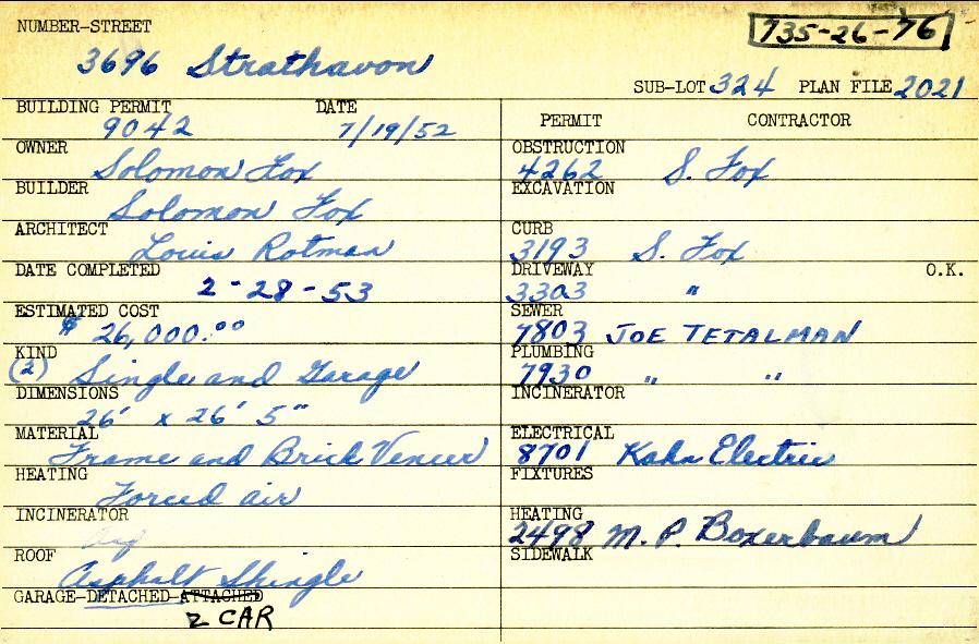 3696 Strathavon Road Shaker Heights, OH 44120 PARCEL ID: 735-26-076 Building Permit Date: 07-19-1952 Plan File Number: 2021, 6383 Microfilm Roll: Roll#31, Roll#85 Neighborhood: Lomond Owner: Fox, Solomon Builder: Fox, Solomon Architect: Rotman, Louis Estimated Cost: 26000 Date Completed: 02-28-1953 Kind: Single Dwelling and Garage (2) Material: Frame and Brick Veneer Heating: Forced Air Roof: Asphalt Shingles Garage: detached 2 car |