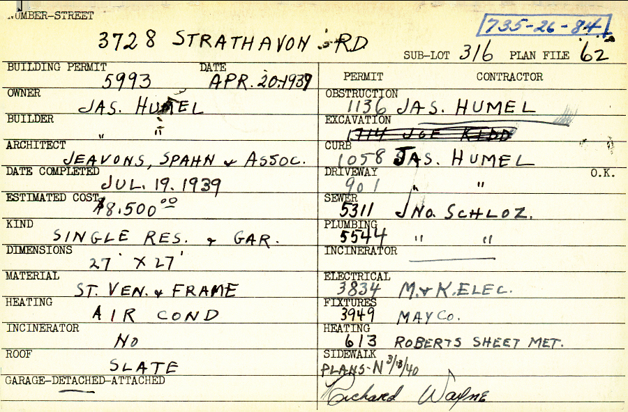 3728 Strathavon Road Shaker Heights, OH 44120 PARCEL ID: 735-26-084 Building Permit Date: 04-20-1939 Neighborhood: Lomond Owner: Humel, James Builder: Humel, James Architect: Jeavons, Spahn and Associates Estimated Cost: 8500 Date Completed: 07-19-1939 Kind: Single Dwelling and Garage Material: Stone Veneer and Frame Heating: Air Conditioned Roof: Slate Garage: detached Blueprints: no blueprints on microfilm |