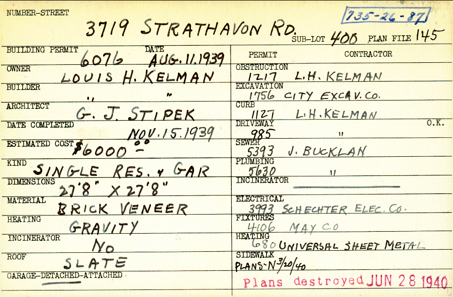 3719 Strathavon Road Shaker Heights, OH 44120 PARCEL ID: 735-26-087 Building Permit Date: 08-11-1939 Plan File Number: 145, 5661 Microfilm Roll: Roll#76 Neighborhood: Lomond Owner: Kelman, Louis H. Builder: Kelman, Louis H. Architect: Stipek, G. J. Estimated Cost: 6000 Date Completed: 11-15-1939 Kind: Single Dwelling and Garage Material: Brick Veneer Heating: Gravity System Roof: Slate Garage: detached |
