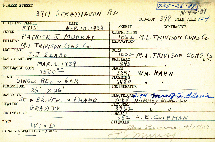 3711 Strathavon Road Shaker Heights, OH 44120 PARCEL ID: 735-26-089 Building Permit Date: 11-10-1938 Plan File Number: 124, 4038 Microfilm Roll: Roll#59 Neighborhood: Lomond Owner: Murray, Patrick J. Builder: M. L. Trivison Construction Company Architect: Szabo, S. J. Estimated Cost: 7500 Date Completed: 03-02-1939 Kind: Single Dwelling and Garage Material: Stone and Brick Veneer and Frame Heating: Gravity System Roof: Wood Garage: detached |