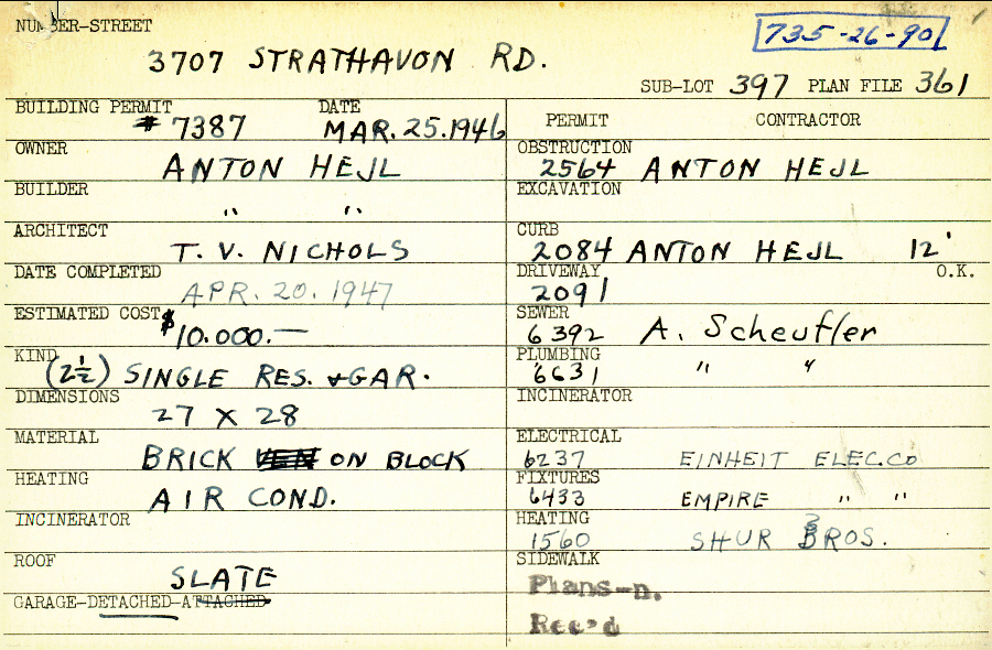 3707 Strathavon Road Shaker Heights, OH 44120 PARCEL ID: 735-26-090 Building Permit Date: 03-25-1946 Plan File Number: 361 all scanned Microfilm Roll: Roll004 Neighborhood: Lomond Owner: Hejl, Anton Builder: Hejl, Anton Architect: Nichols, T. V. Estimated Cost: 10000 Date Completed: 04-20-1947 Kind: Single 2-1/2 Material: Brick on Block Heating: Air Conditioned Roof: Slate Garage: detached |