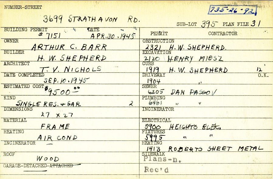 3699 Strathavon Road Shaker Heights, OH 44120 PARCEL ID: 735-26-092 Building Permit Date: 04-30-1945 Plan File Number: 31 scanned, 5144 Microfilm Roll: Roll001, Roll#70 Neighborhood: Lomond Owner: Barr, Arthur C. Builder: Shepherd, H. W. Architect: Nichols, T. V. Estimated Cost: 9500 Date Completed: 09-10-1945 Kind: Single Dwelling and Garage (2) Material: Frame Heating: Air Conditioned Roof: Wood Garage: detached |