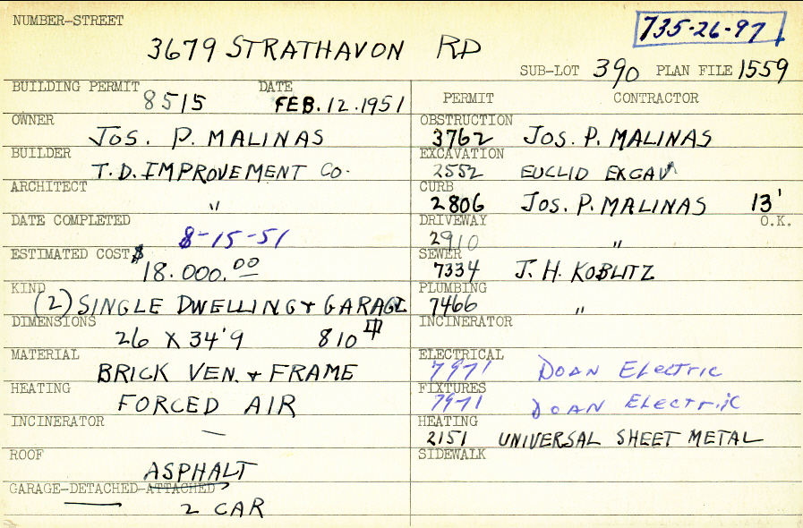 3679 Strathavon Road Shaker Heights, OH 44120 PARCEL ID: 735-26-097 Building Permit Date: 02-12-1951 Plan File Number: 1559 scanned, 5813 Microfilm Roll: Roll024, Roll#79 Neighborhood: Lomond Owner: Malinas, Joseph P. Builder: T. D. Improvement Company Architect: T. D. Improvement Company Estimated Cost: 18000 Date Completed: 08-15-1951 Kind: Single Dwelling and Garage (2) Material: Brick Veneer and Frame Heating: Forced Air Roof: Asphalt Garage: detached 2 car |