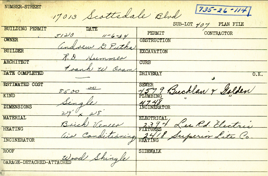 17013 Scottsdale Boulevard Shaker Heights, OH 44120 PARCEL ID: 735-26-114 Building Permit Date: 11-06-1934 Plan File Number: 0 Neighborhood: Lomond Owner: Putha, Andrew G. Builder: Hummer, R. D. Architect: Oram, Frank W. Estimated Cost: 8500 Kind: Single, Single Residence or Dwelling Material: Brick Veneer Heating: Air Conditioned Roof: Wood Shingle Card Available: yes |
