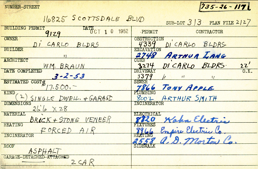 16825 Scottsdale Boulevard Shaker Heights, OH 44120 PARCEL ID: 735-26-117 Building Permit Date: 10-10-1952 Plan File Number: 2127, 4183 Microfilm Roll: Roll#32, Roll#61 Neighborhood: Lomond Owner: DiCarlo Builders Builder: DiCarlo Builders Architect: Braun, William Estimated Cost: 17500 Date Completed: 03-02-1953 Kind: Single Dwelling and Garage (2) Material: Brick and Stone Veneer Heating: Forced Air Roof: Asphalt Garage: detached 2 car |