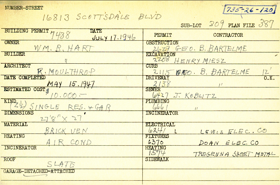 16813 Scottsdale Boulevard Shaker Heights, OH 44120 PARCEL ID: 735-26-120 Building Permit Date: 07-17-1946 Plan File Number: 387 all scanned Microfilm Roll: Roll004 Neighborhood: Lomond Owner: Hart, William B. Builder: Hart, William B. Architect: Moulthrop, R. Estimated Cost: 10000 Date Completed: 05-15-1947 Kind: Single 2-1/2 Material: Brick Veneer Heating: Air Conditioned Roof: Slate Garage: detached |
