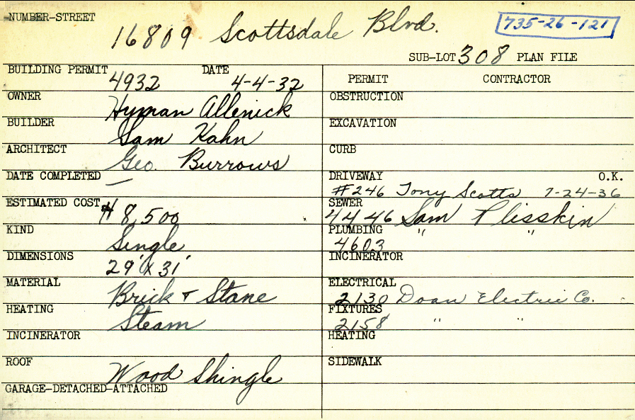 16809 Scottsdale Boulevard Shaker Heights, OH 44120 PARCEL ID: 735-26-121 Building Permit Date: 04-04-1932 Plan File Number: 0 Neighborhood: Lomond Owner: Allenick, Hyman Builder: Kahn, Sam Architect: Burrows, George Estimated Cost: 8500 Kind: Single, Single Residence or Dwelling Material: Brick and Stone Heating: Steam Roof: Wood Shingle |