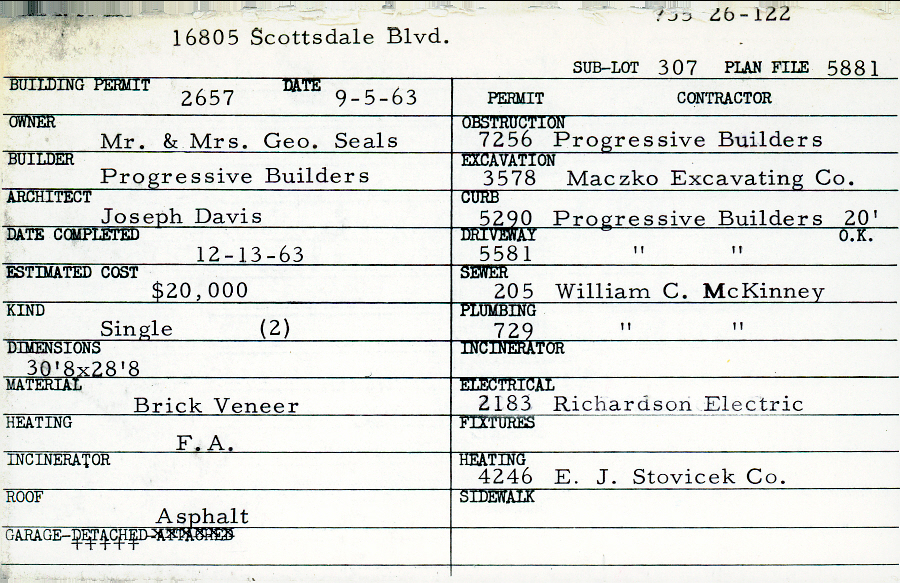 16805 Scottsdale Boulevard Shaker Heights, OH 44120 PARCEL ID: 735-26-122 Building Permit Date: 09-05-1963 Plan File Number: 5881, 9462 Microfilm Roll: Roll#79, Roll#103 Neighborhood: Lomond Owner: Seals, Mr. and Mrs. George Builder: Progressive Builders Architect: Davis, Joseph Estimated Cost: 20000 Date Completed: 12-13-1963 Kind: Single, Single Residence or Dwelling (2) Material: Brick Veneer Heating: Forced Air Roof: Asphalt Garage: detached |
