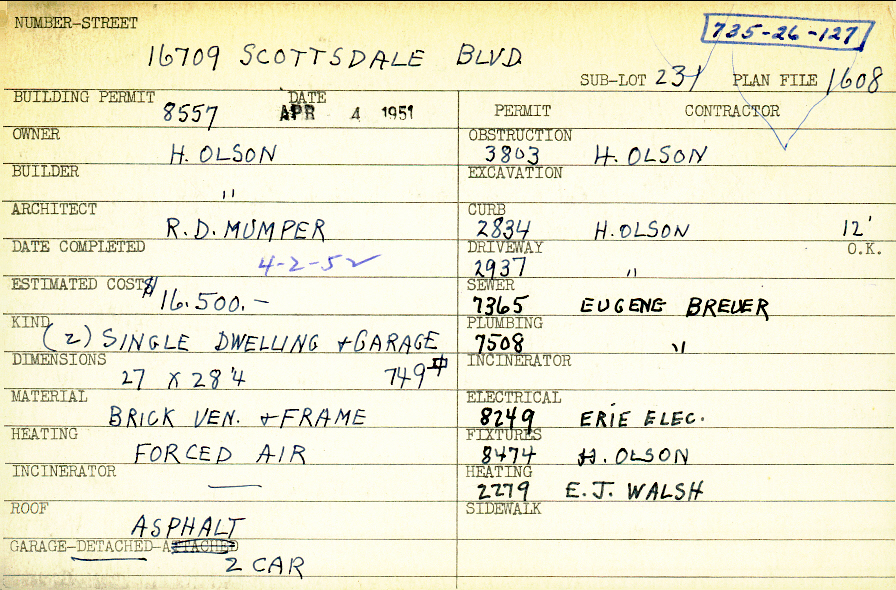 16709 Scottsdale Boulevard Shaker Heights, OH 44120 PARCEL ID: 735-26-127 Building Permit Date: 04-04-1951 Plan File Number: 1608 all scanned Microfilm Roll: Roll025 Neighborhood: Moreland Owner: Olson, H. Builder: Olson, H. Architect: Mumper, R. D. Estimated Cost: 16500 Date Completed: 04-02-1952 Kind: Single Dwelling and Garage (2) Material: Brick Veneer and Frame Heating: Forced Air Roof: Asphalt Garage: detached 2 car |
