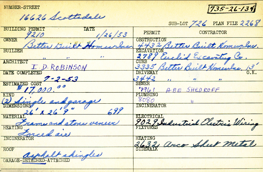 16626 Scottsdale Boulevard Shaker Heights, OH 44120 PARCEL ID: 735-26-134 Building Permit Date: 01-26-1953 Plan File Number: 1507 scanned, 2268, 7913 Microfilm Roll: Roll024, Roll#33, Roll#95 Owner: Better Built Homes Inc. Builder: Better Built Homes Inc. Architect: Robinson, I. D. Estimated Cost: 17000 Date Completed: 07-02-1953 Kind: Single Dwelling and Garage (2) Material: Frame and Stone Veneer Heating: Forced Air Roof: Asphalt Shingles Garage: detached |