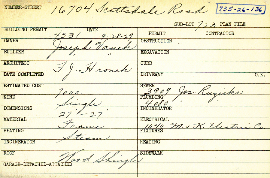 16704 Scottsdale Boulevard Shaker Heights, OH 44120 PARCEL ID: 735-26-136 Building Permit Date: 09-28-1929 Plan File Number: 0 Neighborhood: Moreland Owner: Vanek, Joseph Builder: Vanek, Joseph Architect: Hronek, F. J. Estimated Cost: 7000 Kind: Single, Single Residence or Dwelling Material: Frame Heating: Steam Roof: Wood Shingle Card Available: yes |