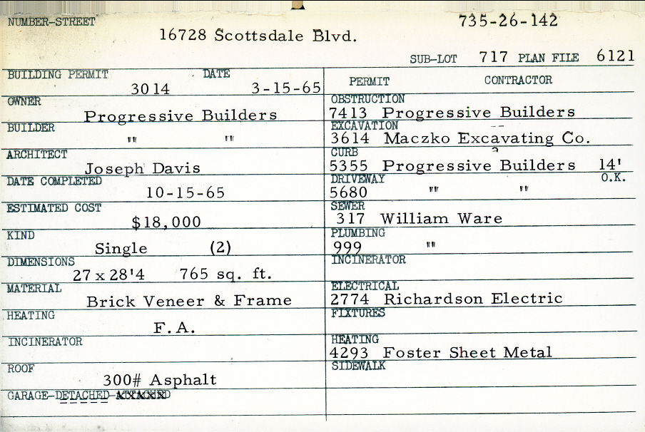 16728 Scottsdale Boulevard Shaker Heights, OH 44120 PARCEL ID: 735-26-142 Building Permit Date: 03-15-1965 Plan File Number: 6121, 6958 Microfilm Roll: Roll#83, Roll#90 Neighborhood: Lomond Owner: Progressive Builders Builder: Progressive Builders Architect: Davis, Joseph Estimated Cost: 18000 Date Completed: 10-15-1965 Kind: Single, Single Residence or Dwelling (2) Material: Brick Veneer and Frame Heating: Forced Air Roof: 300# Min Asphalt Garage: detached |