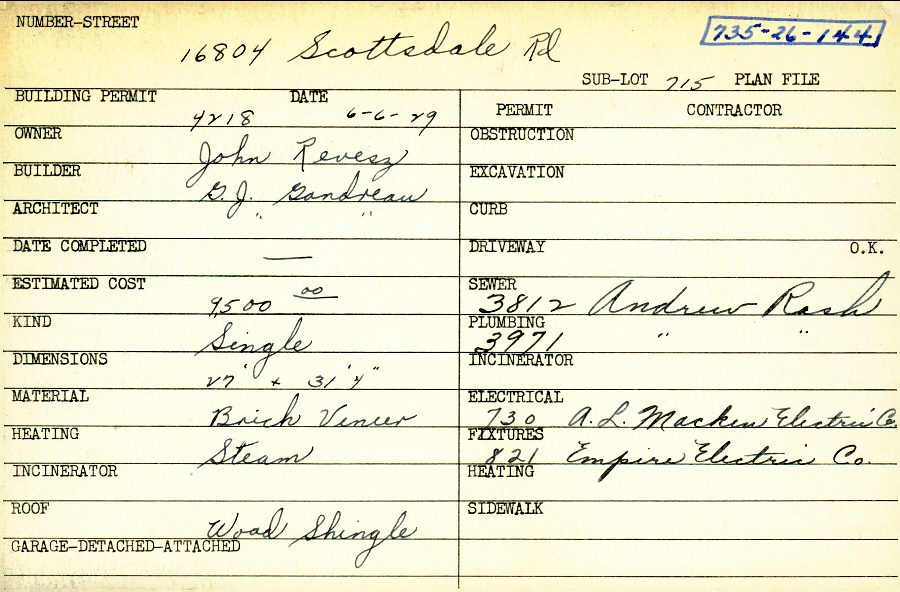 16804 Scottsdale Boulevard Shaker Heights, OH 44120 PARCEL ID: 735-26-144 Building Permit Date: 06-06-1929 Plan File Number: 0 Neighborhood: Lomond Owner: Revesz, John Builder: Gandreau, G. J. Architect: Gandreau, G. J. Estimated Cost: 9500 Kind: Single, Single Residence or Dwelling Material: Brick Veneer Heating: Steam Roof: Wood Shingle Card Available: yes |