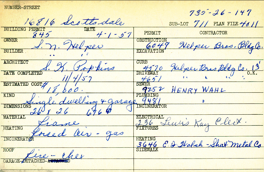 16816 Scottsdale Boulevard Shaker Heights, OH 44120 PARCEL ID: 735-26-147 Building Permit Date: 04-01-1957 Plan File Number: 4011 Microfilm Roll: Roll#58 Neighborhood: Lomond Owner: Helper, S. N. Builder: Helper, S. N. Architect: Popkins, S. K. Estimated Cost: 18000 Date Completed: 11-04-1957 Kind: Single Dwelling and Garage Material: Frame Heating: Forced Air - Gas Garage: detached |