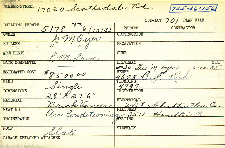 17020 Scottsdale Boulevard Shaker Heights, OH 44120 PARCEL ID: 735-26-156 Building Permit Date: 06-10-1935 Plan File Number: 1642 all scanned Microfilm Roll: Roll025 Neighborhood: Lomond Owner: Oyer, G. M. Builder: Oyer, G. M. Architect: Lowe, C. N. Estimated Cost: 8500 Kind: Single, Single Residence or Dwelling Material: Brick Veneer Heating: Air Conditioned Roof: Slate |