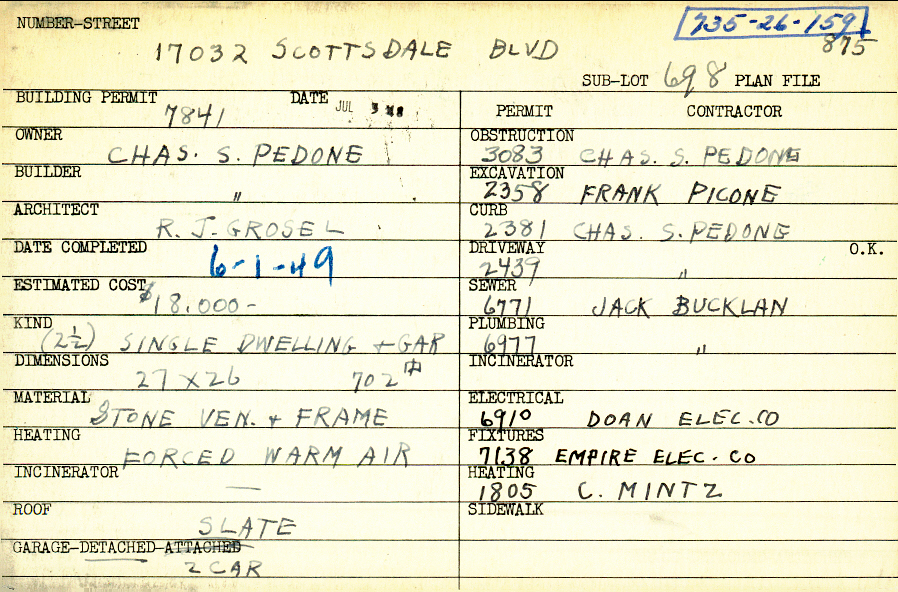 17032 Scottsdale Boulevard Shaker Heights, OH 44120 PARCEL ID: 735-26-159 Building Permit Date: 07-03-1948 Plan File Number: 875 all scanned Microfilm Roll: Roll011 Neighborhood: Lomond Owner: Pedone, Charles S. Builder: Pedone, Charles S. Architect: Grosel, Rudolph J. Estimated Cost: 18000 Date Completed: 06-01-1949 Kind: Single 2-1/2 Material: Stone Veneer and Frame Heating: Forced Air Roof: Slate Garage: detached 2 car Blueprints: online, see link above |