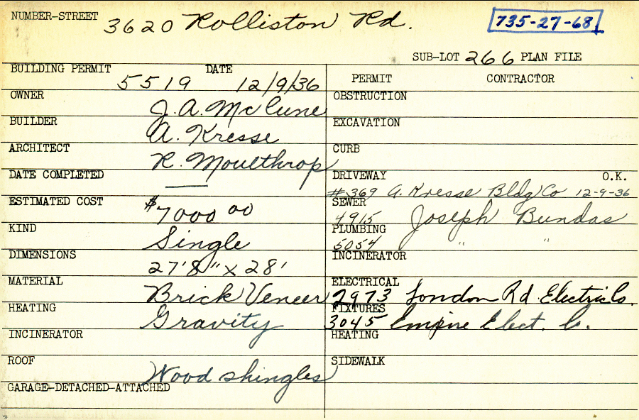 3620 Rolliston Road Shaker Heights, OH 44120 PARCEL ID: 735-27-068 Building Permit Date: 12-09-1936 Plan File Number: 3279, 12426 Microfilm Roll: Roll#48, NewRoll#13 Neighborhood: Lomond Owner: McCune, J. A. Builder: Kresse, A. Architect: Moulthrop, R. Estimated Cost: 7000 Kind: Single, Single Residence or Dwelling Material: Brick Veneer Heating: Gravity System Roof: Wood Shingle |