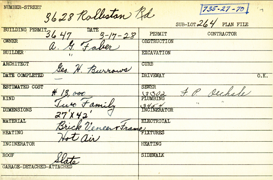 3628 Rolliston Road Shaker Heights, OH 44120 PARCEL ID: 735-27-070 Building Permit Date: 03-17-1928 Plan File Number: 0 Neighborhood: Lomond Owner: Faber, A. G. Builder: Faber, A. G. Architect: Burrows, George H. Estimated Cost: 13000 Kind: Duplex or Two-Family Material: Brick Veneer and Frame Heating: Hot Air Roof: Slate |