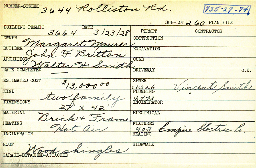3644 Rolliston Road Shaker Heights, OH 44120 PARCEL ID: 735-27-074 Building Permit Date: 03-23-1928 Plan File Number: 0 Neighborhood: Lomond Owner: Maurer, Margaret Builder: Britton, John F. Architect: Smith, Walter H. Estimated Cost: 13000 Kind: Duplex or Two-Family Material: Brick and Frame Heating: Hot Air Roof: Wood Shingle Card Available: yes |