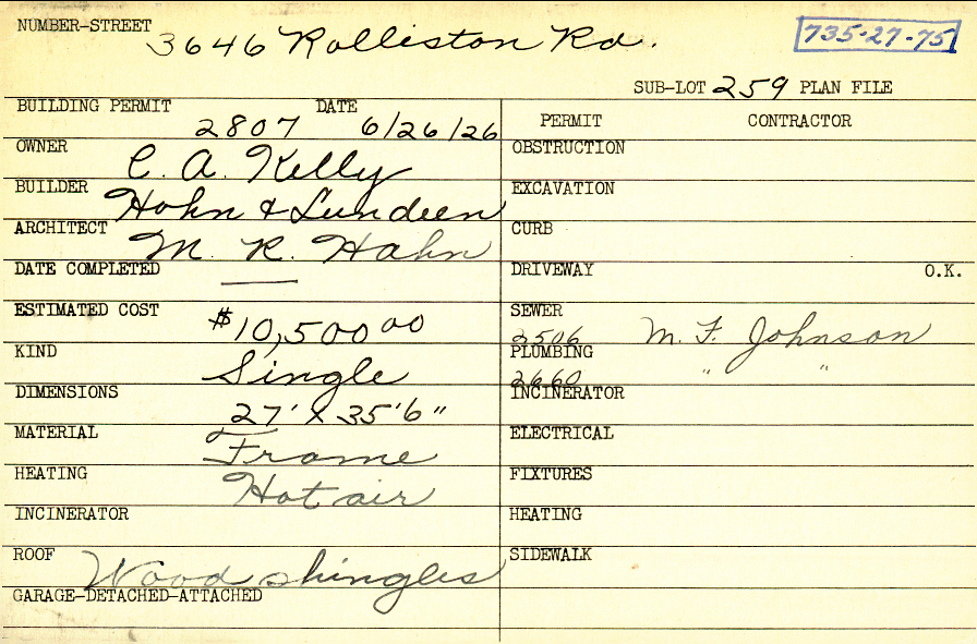 3646 Rolliston Road Shaker Heights, OH 44120 PARCEL ID: 735-27-075 Building Permit Date: 06-26-1926 Plan File Number: 9282 Microfilm Roll: Roll#102 Neighborhood: Lomond Owner: Kelly, C. A. Builder: Hahn and Lundeen Architect: Hahn, M. R. Estimated Cost: 10500 Kind: Single, Single Residence or Dwelling Material: Frame Heating: Hot Air Roof: Wood Shingle |