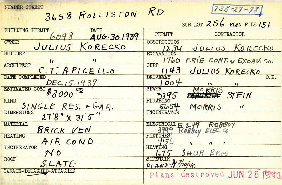 3658 Rolliston Road Shaker Heights, OH 44120 PARCEL ID: 735-27-078 Building Permit Date: 08-30-1939 Plan File Number: 151 Neighborhood: Lomond Owner: Korecko, Julius Builder: Korecko, Julius Architect: Apicello, C. T. Estimated Cost: 8000 Date Completed: 12-15-1939 Kind: Single Dwelling and Garage Material: Brick Veneer Heating: Air Conditioned Roof: Slate Garage: detached |