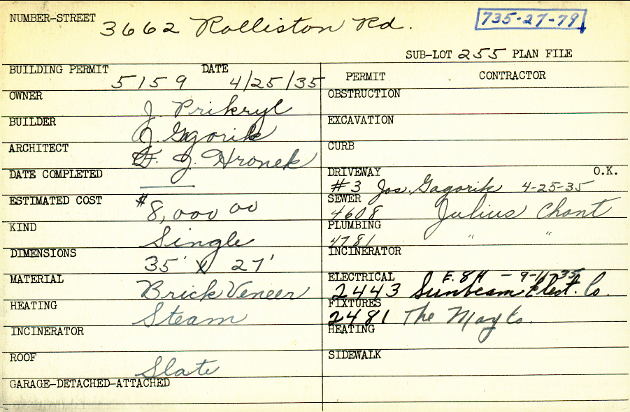 3662 Rolliston Road Shaker Heights, OH 44120 PARCEL ID: 735-27-079 Building Permit Date: 04-25-1935 Plan File Number: 7627 Microfilm Roll: Roll#94 Neighborhood: Lomond Owner: Prikryl, J. Builder: Gagorik, J. Architect: Hronek, F. J. Estimated Cost: 8000 Kind: Single, Single Residence or Dwelling Material: Brick Veneer Heating: Steam Roof: Slate |