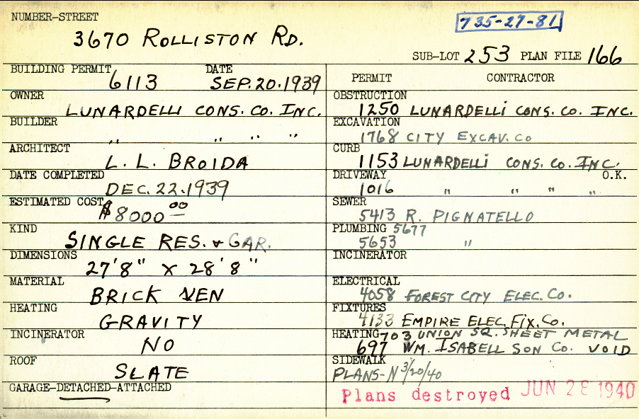 3670 Rolliston Road Shaker Heights, OH 44120 PARCEL ID: 735-27-081 Building Permit Date: 09-20-1939 Plan File Number: 166 Neighborhood: Lomond Owner: Lunardelli Construction Company, Inc. Builder: Lunardelli Construction Company, Inc. Architect: Broida, L. L. Estimated Cost: 8000 Date Completed: 12-22-1939 Kind: Single Dwelling and Garage Material: Brick Veneer Heating: Gravity System Roof: Slate Garage: detached |