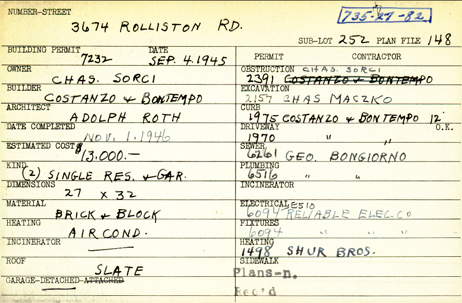 3674 Rolliston Road Shaker Heights, OH 44120 PARCEL ID: 735-27-082 Building Permit Date: 09-04-1945 Plan File Number: 148 scanned, 7969 Microfilm Roll: Roll001, Roll#95 Neighborhood: Lomond Owner: Sorci, Charles Builder: Costanzo and Bontempo Architect: Roth, Adolph Estimated Cost: 13000 Date Completed: 11-01-1946 Kind: Single Dwelling and Garage (2) Material: Brick and Block Heating: Air Conditioned Roof: Slate Garage: detached |