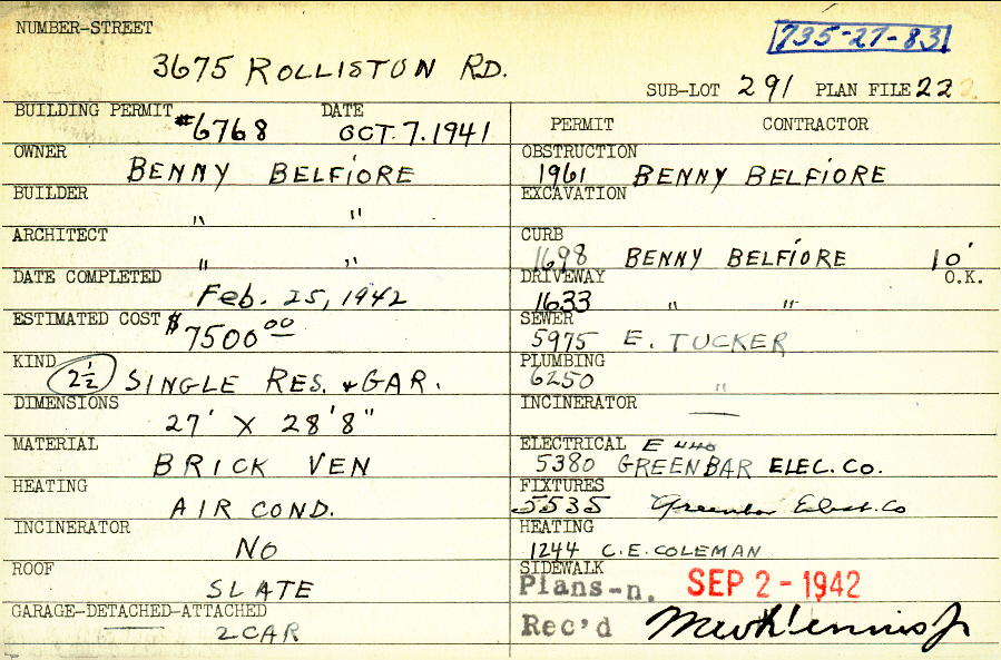 3675 Rolliston Road Shaker Heights, OH 44120 PARCEL ID: 735-27-083 Building Permit Date: 10-07-1941 Plan File Number: 22 Neighborhood: Lomond Owner: Belfiore, Benny Builder: Belfiore, Benny Architect: Belfiore, Benny Estimated Cost: 7500 Date Completed: 02-25-1942 Kind: Single 2-1/2 Material: Brick Veneer Heating: Air Conditioned Roof: Slate Garage: detached 2 car |