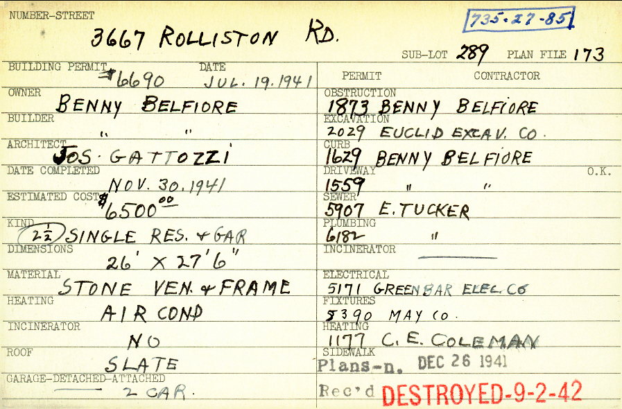 3667 Rolliston Road Shaker Heights, OH 44120 PARCEL ID: 735-27-085 Building Permit Date: 07-19-1941 Plan File Number: 173 Neighborhood: Lomond Owner: Belfiore, Benny Builder: Belfiore, Benny Architect: Gattozzi, Joseph Estimated Cost: 6500 Date Completed: 11-30-1941 Kind: Single 2-1/2 Material: Stone Veneer and Frame Heating: Air Conditioned Roof: Slate Garage: detached 2 car |