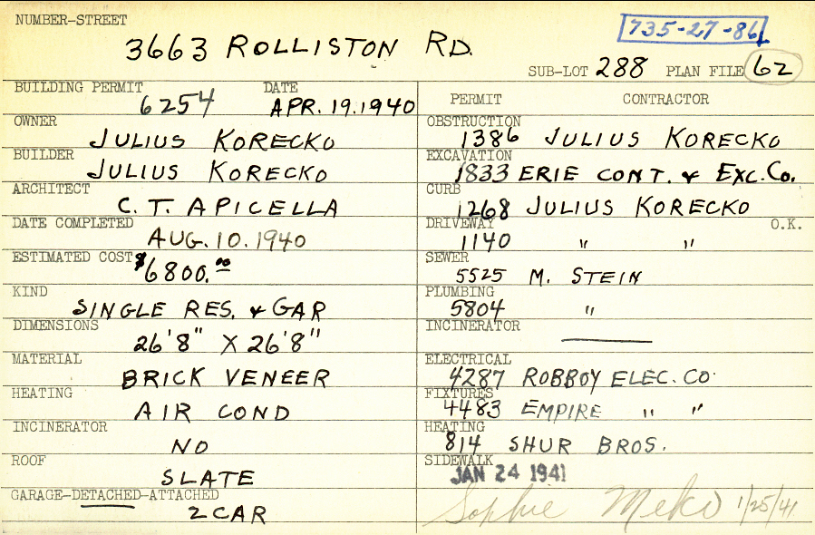 3663 Rolliston Road Shaker Heights, OH 44120 PARCEL ID: 735-27-086 Building Permit Date: 04-19-1940 Plan File Number: 62 Neighborhood: Lomond Owner: Korecko, Julius Builder: Korecko, Julius Architect: Apicella, C. T. Estimated Cost: 6800 Date Completed: 08-10-1940 Kind: Single Dwelling and Garage Material: Brick Veneer Heating: Air Conditioned Roof: Slate Garage: detached 2 car |