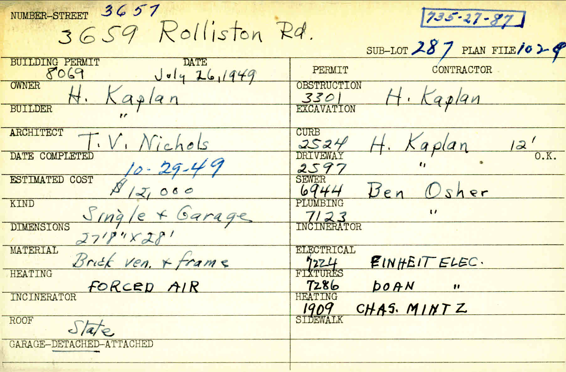 3657 Rolliston Road Shaker Heights, OH 44120 PARCEL ID: 735-27-087 Building Permit Date: 07-26-1949 Plan File Number: 1029 all scanned Microfilm Roll: Roll013 Neighborhood: Lomond Owner: Kaplan, H. Builder: Kaplan, H. Architect: Nichols, T.V. Estimated Cost: 12000 Date Completed: 10-29-1949 Kind: Single Dwelling and Garage Material: Brick Heating: Forced Air Roof: Slate Garage: detached Card Available: Yes |