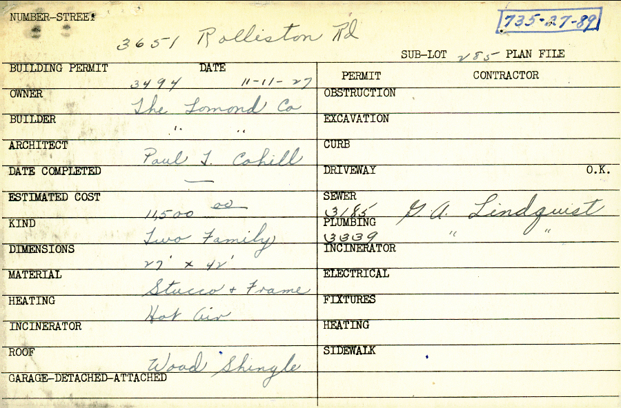 3651 Rolliston Road Shaker Heights, OH 44120 PARCEL ID: 735-27-089 Building Permit Date: 11-11-1927 Plan File Number: 11356 Microfilm Roll: NewRoll#7 Neighborhood: Lomond Owner: The Lomond Company Builder: The Lomond Company Architect: Cahill, Paul T. Estimated Cost: 11500 Kind: Duplex or Two-Family Material: Stucco and Frame Heating: Hot Air Roof: Wood Shingle |